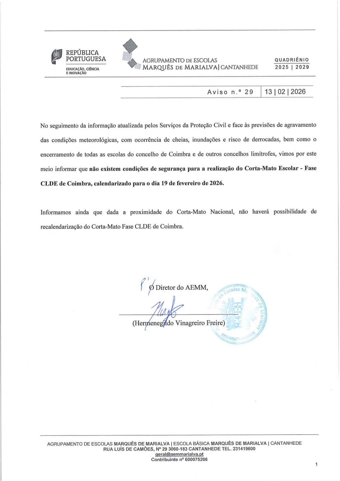 Aviso n.º 29 - Cancelamento de Corta-Mato Escolar